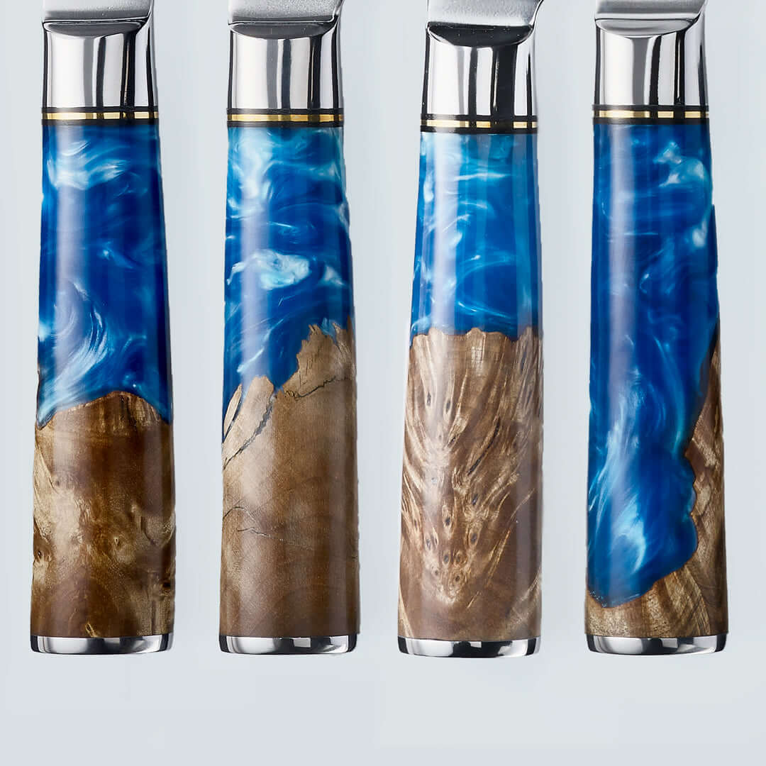 - Unique handle designs crafted from stabilised burl wood and blue resin for durability.